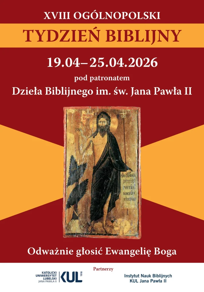 W dniach od 19 do 25 kwietnia 2026 r. będziemy przeżywać w polskim Kościele pod patronatem Dzieła Biblijnego im. św. Jana Pawła II Niedzielę Biblijną (19 kwietnia br.), Osiemnasty Ogólnopolski Tydzień Biblijny oraz Dziesiąte Narodowe Czytanie Pisma Świętego. Hasłem przewodnim XVIII Ogólnopolskiego Tygodnia Biblijnego są słowa: „Odważnie głosić Ewangelię Boga”.