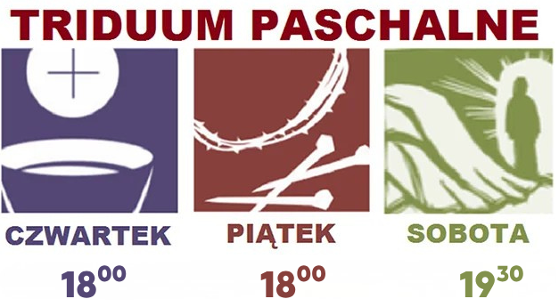 4. Wielki Czwartek – Msza Wieczerzy Pańskiej zostanie odprawiona o godz. 18.00, po Mszy św. przeniesienie Najświętszego Sakramentu do „ciemnicy”. Adoracja do godz. 22.00. Tego dnia nie ma Mszy św. porannej.