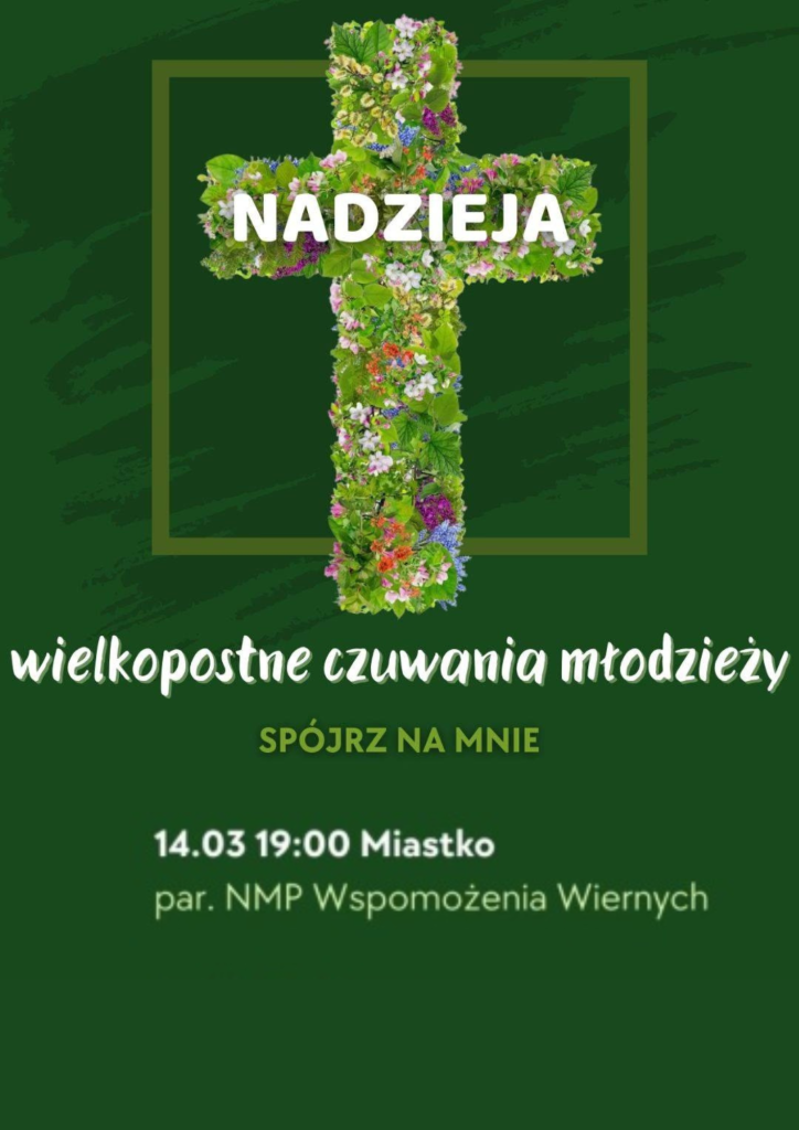 W najbliższy piątek (14.03.) o godz. 19.00 w naszym kościele odbędzie się Wielkopostne Czuwanie Młodych pod hasłem „Nadzieja”. Nabożeństwu będzie przewodniczył Ks. Biskup. Nie będzie zatem w ten piątek Drogi krzyżowej dla młodzieży, dla kandydatów do bierzmowania udział w czuwaniu jest obowiązkowym punktem formacyjnym. Zapraszamy!