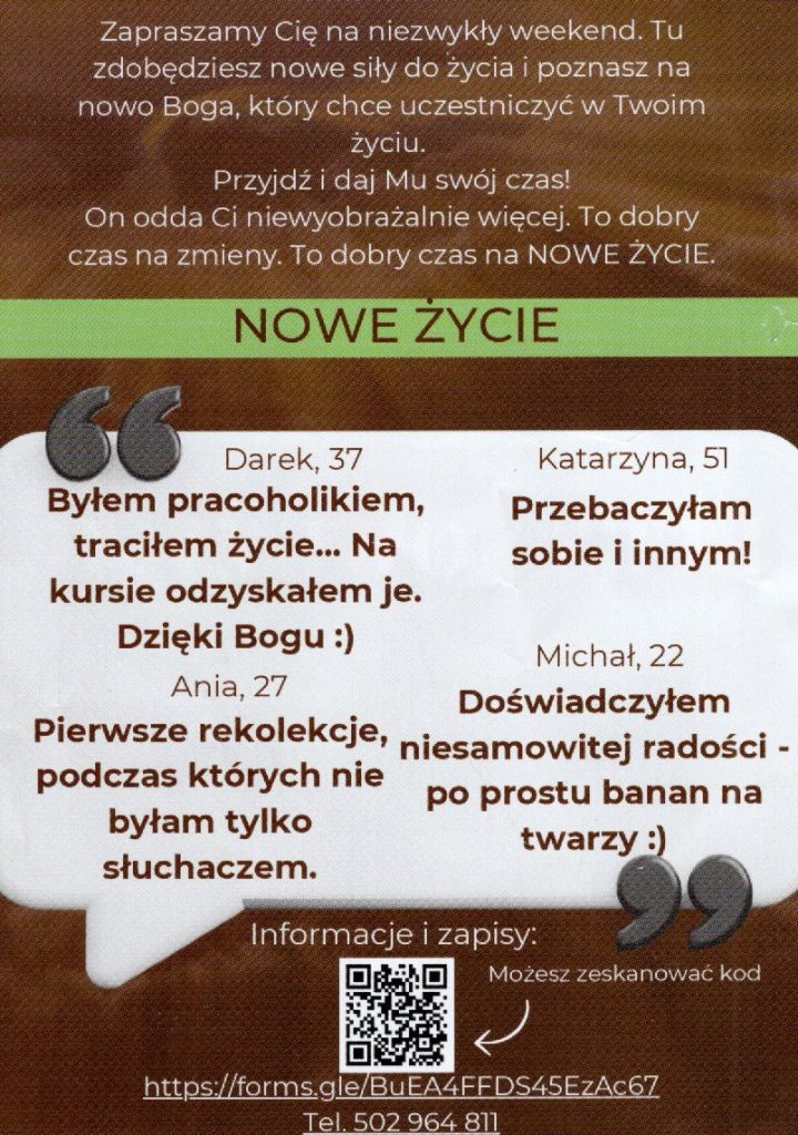W tytule przelewu: kurs Nowe Życie + imię i nazwisko uczestnika